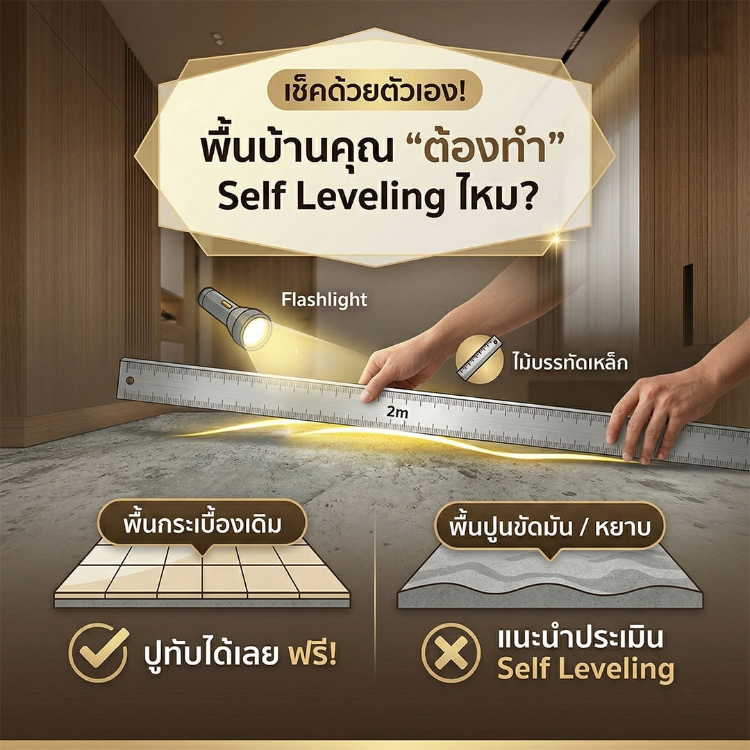 รักษาชีวิตพื้น SPC (ป้องกันลิ้นหัก): พื้นคลิกล็อคต้องการความเรียบระดับมิลลิเมตร หากเทปูนธรรมดาแล้วเป็นคลื่น แผ่นพื้น SPC จะขยับตัว เสียดสี และลิ้นหักในที่สุด ซึ่งค่ารื้อพื้นมาปูใหม่… แพงกว่าค่าเท Self Leveling หลายเท่าครับ!