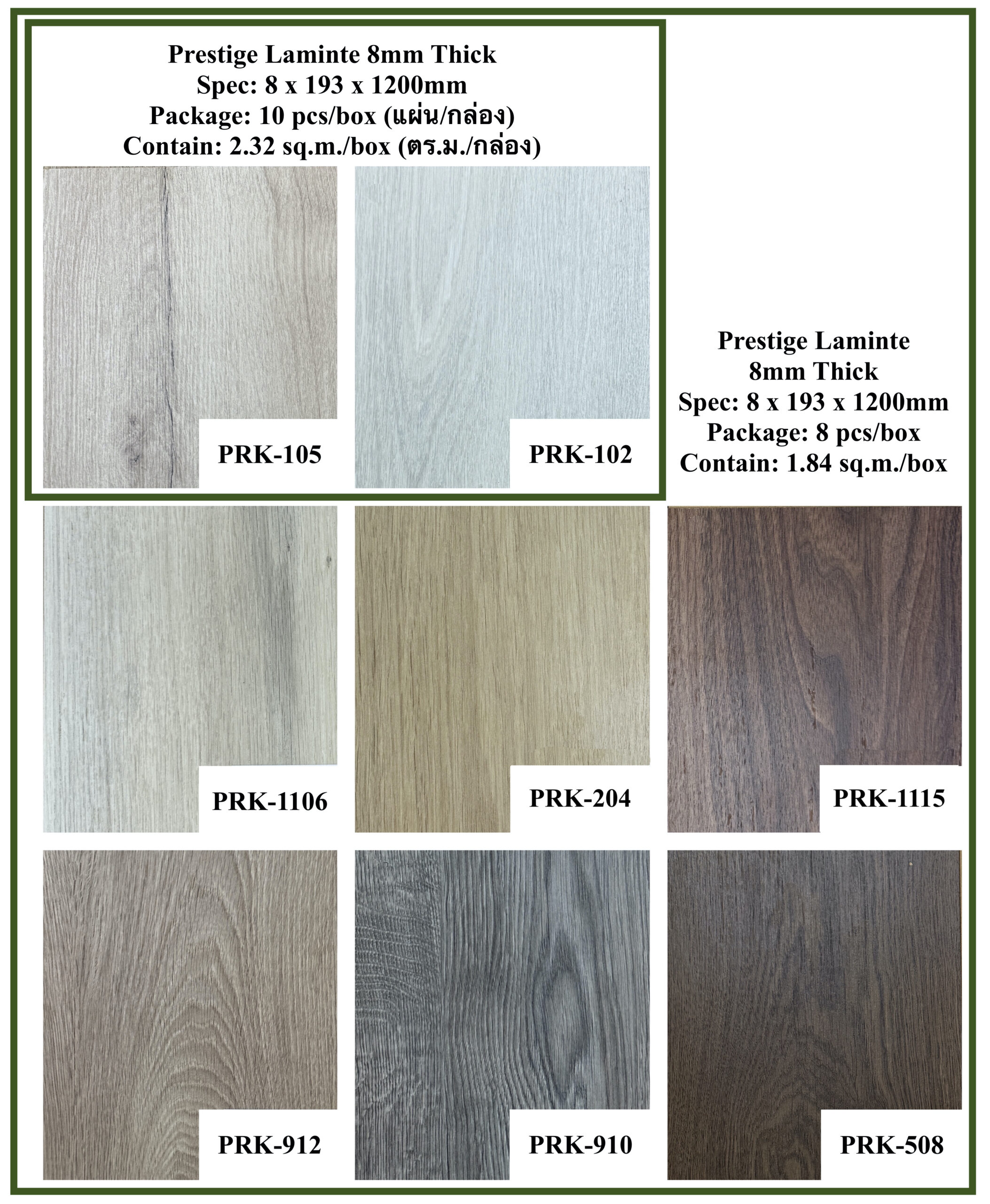 - พื้นไม้ลามิเนต ความหนา 8 มิลลิเมตร กว้าง 8 นิ้ว ยาว 1.20 เมตร